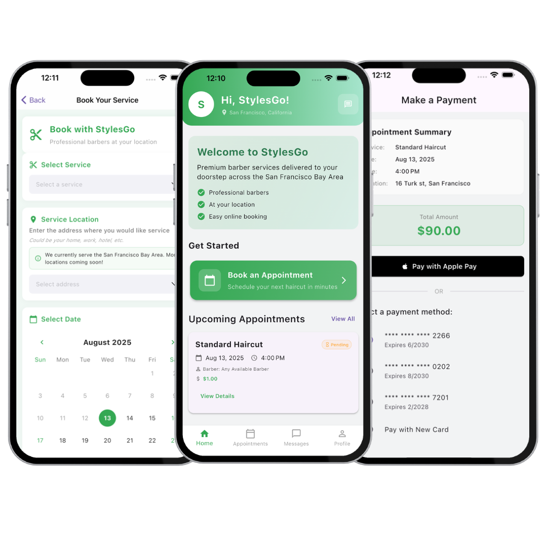 Professional mobile haircuts delivered to your door. StylesGo connects you with licensed, vetted barbers who come to your home, hotel, hospital, or event. SF Bay Area and DC Metro.